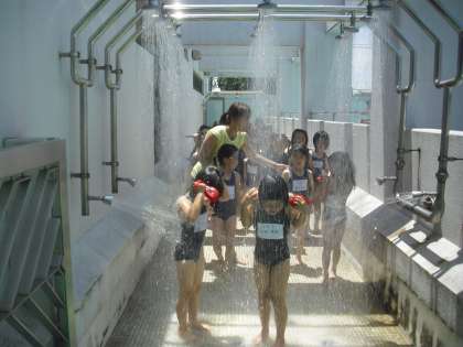 1年生のプール開きの様子です。1年生にとって初めてのプール。しかも中学校のプールですから大きく感じたと思います。水位は1年生用に下げてあります。シャワーが気持ちよさそうです。
