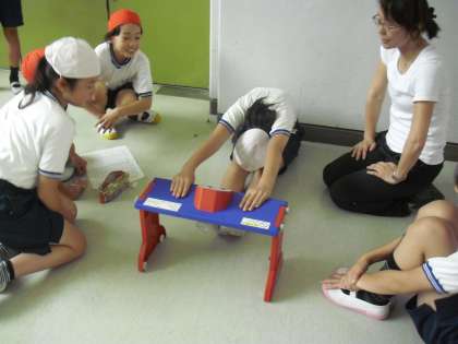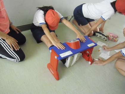 長座体前屈の様子です。体の柔軟性を知る運動です。背中をかべに着けて直角の長座の上体から両腕で計測器を前におし出します。押した距離を記録していきます。