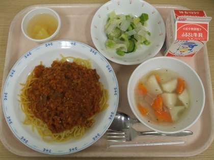 今日の「スパゲッティミートソース」の“ミートソース”は、たっぷりのたまねぎを使い、あめ色になるまでじっくり炒めて、甘味を出しました。100Kg近いたまねぎは、切っても切ってもなかなか終わらず、大変な作業でした。