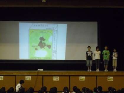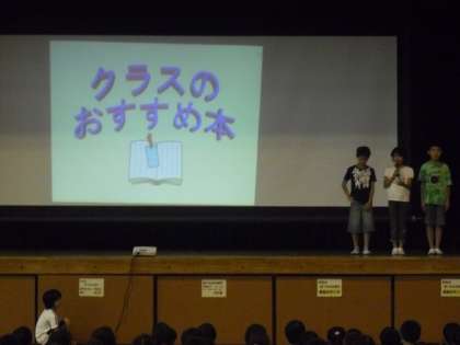 今朝の児童集会の様子です。今回は図書委員会の発表です。まず、「クラスのおすすめ本」の紹介です。各クラスからの代表児童のおすすめ本を紹介しました。図書委員会の「おすすめ本」の紹介もしました。