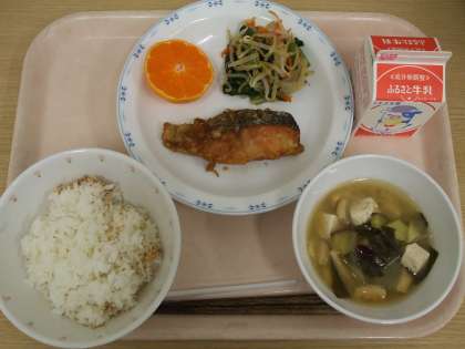 米(千葉)、鮭(北海道)、豆腐(東京)、油揚げ(神奈川)、白ごま(ナイジェリア・パラグアイ)、カットわかめ(岩手)、みかん(長崎)、しょうが(高知)、ねぎ(新潟)、小松菜(茨城)、もやし(栃木)、にんじん・さつまいも(千葉)、たまねぎ(北海道)