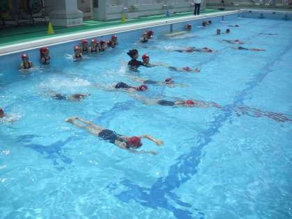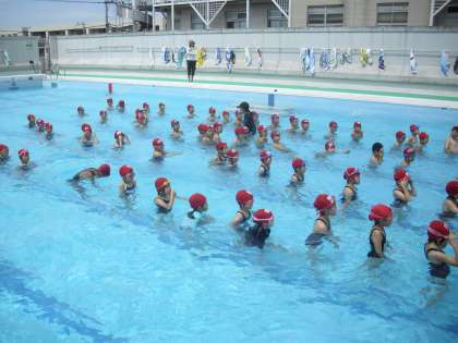 2年生のプールの授業の様子です。けのびの練習をしています。手足をしっかりと伸ばして水面に浮きます。気温が高かったので、子どもたちは気持ちよさそうに水と仲良くしていました。