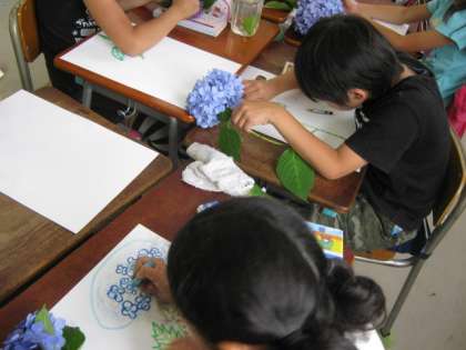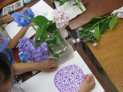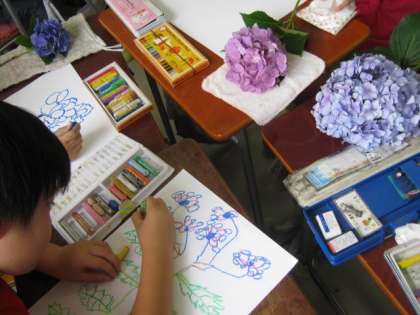 図工ではあじさいの花を見て、画用紙にクレヨンで表現しています。