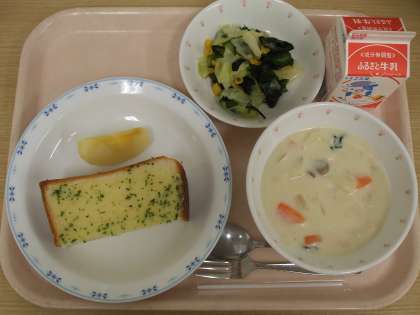 ミルク食パン(東京)、鶏肉(北海道)、冷凍鶏ガラ(神奈川)、バター(北海道・宮崎)、生クリーム(北海道)、粉チーズ(ニュージーランド)、豆乳(愛知)、カットわかめ(岩手)、マッシュルーム水煮(岡山)、ホールコーン・たまねぎ・じゃがいも(北海道)、りんご(長野)、にんにく(青森)、パセリ・小松菜(茨城)、にんじん(千葉)、きゅうり(埼玉)、キャベツ(愛知・神奈川)
