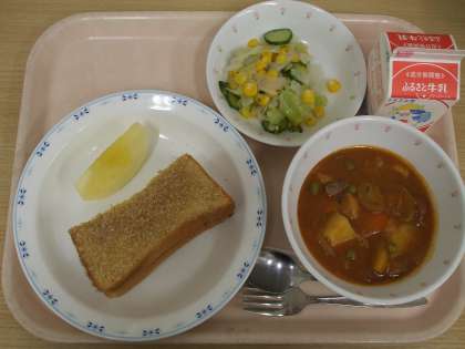 ミルク食パン(東京)、豚肉(秋田)、冷凍鶏ガラ(神奈川)、ベーコン(日本・デンマーク)、きんとき豆(北海道)、バター(北海道・宮崎)、白すりごま(ナイジェリア・パラグアイ)、はちみつ(アルゼンチン)、ダイストマト(イタリア)、マッシュルーム水煮(岡山)、冷凍グリンピース(ニュージーランド)、ホールコーン・たまねぎ・じゃがいも(北海道)、にんにく・りんご(青森)、にんじん・大根(千葉)、キャベツ(茨城)、セロリー(福岡)、きゅうり(宮崎)