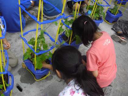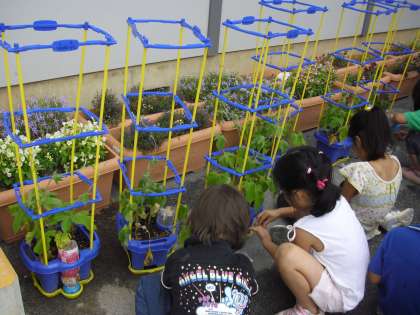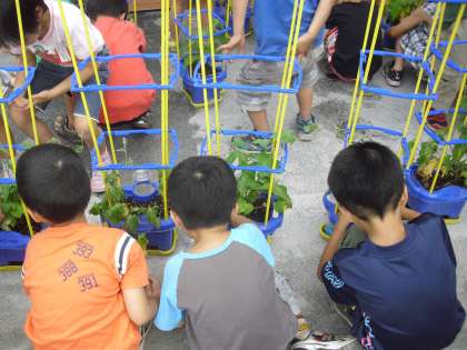 1年生の生活科の授業の様子です。アサガオの鉢に肥料を入れているところです。小さな肥料を一つずつ大切そうに入れていました。お水をあげてお世話をしました。