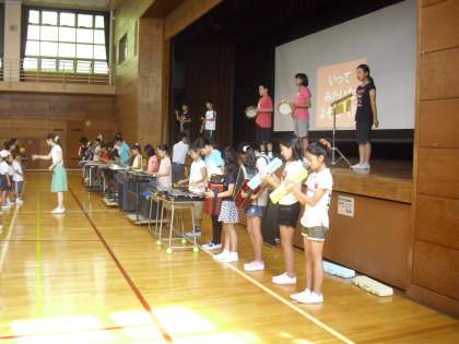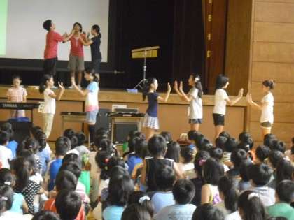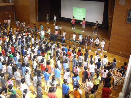 今朝の音楽朝会の様子です。今月の歌は「うみ」です。器楽委員会の演奏で歌いました。ただ歌うだけでなく、リズムに合わせて動きを付けます。器楽委員会の子どもたちが見本を見せます。