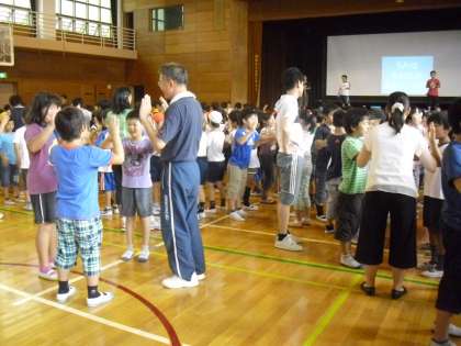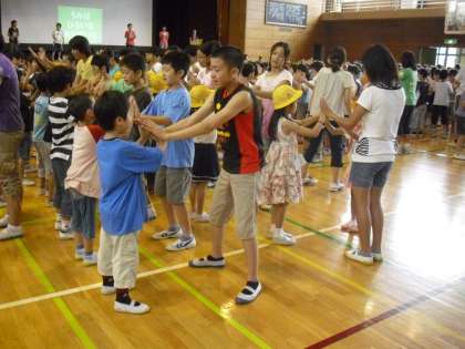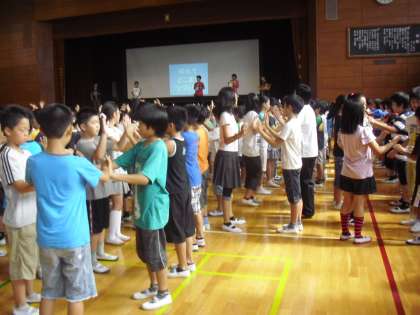 自分のひざに手を当てたり、相手の両手と合わせたりという動きを取り入れながら、歌いました。異学年の人と、クラスの友達と、先生もいっしょに楽しく行いました。