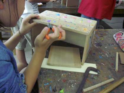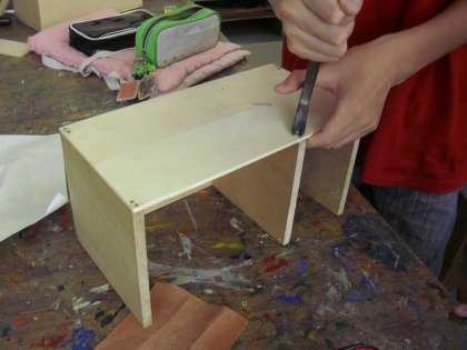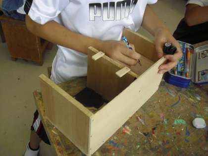 6年生の図画工作の授業の様子です。木工作品の制作に取り組んでいるところです。生活に役立つものを作ります。電動糸のこを使って部品を作ったり、金づちやバールを使って組み立てたりしながら作っています。