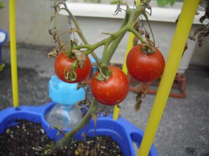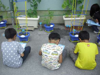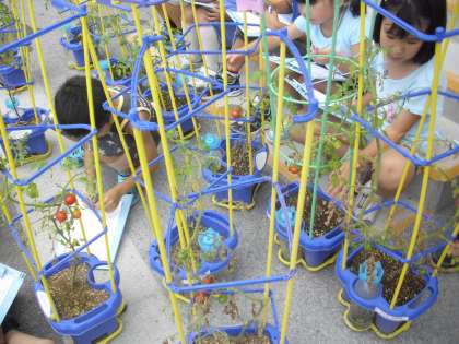 2年生の生活科の授業の様子です。育てているミニトマトの観察をしているところです。トマトの実が赤く色付いているものも出てきました。子どもたちはトマトの生長を喜びながら観察していました。