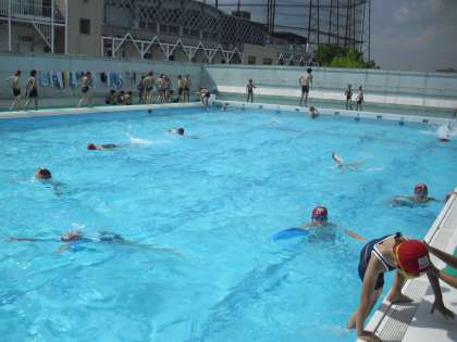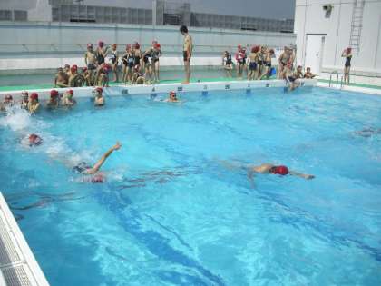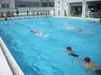 5年生の水泳の授業の様子です。自分の課題の泳法の泳ぎこみをしているところです。少ないストロークとゆったりとしたフォームで泳ぎながら、伸びのある泳ぎ方をイメージしていきます。