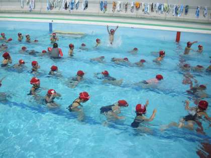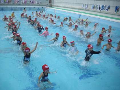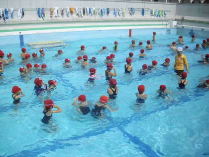 1年生の水遊びの授業の様子です。水の中で跳んだり、はねたり。水しぶきが気持ちよさそうです。顔までつかってブクブクブク。バブリングやボビングは息つぎの基礎につながる大事な技能です。