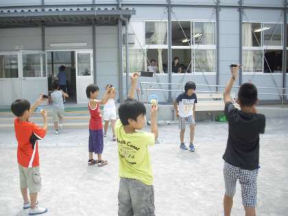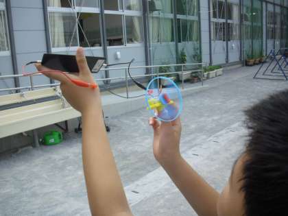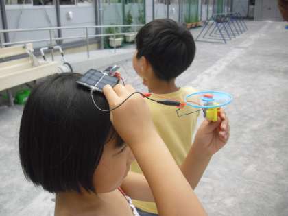 4年生の理科の授業の様子です。「電気のはたらき」を学習しているところです。実験キットを使って楽しく勉強しています。校庭に出て、ソーラー電池の仕組みを利用して、プロペラを動かしています。