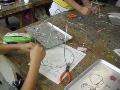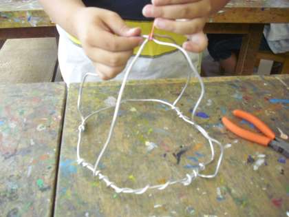 5年生の図画工作の授業の様子です。新しい作品「光のファンタジー」の制作に取りかかったところです。針金と和紙を使った和製ステンドグラスです。自分が考えたイメージ図をもとに作っていきます。