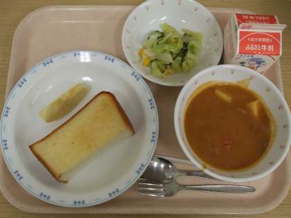 ミルク食パン(東京)、豚肉(北海道)、冷凍鶏ガラ(神奈川)、バター(北海道)、ひよこ豆(アメリカ)、マッシュルーム水煮(山形)、ホールコーン・たまねぎ・じゃがいも(北海道)、トマト・キャベツ(愛知)、パセリ(茨城)、きゅうり(宮崎)、大根(千葉)、りんご(青森)