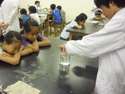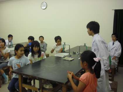 中学校主催で行った5年生以上対象の「わくわく実験教室」の様子です。14名の5・6年生参加しました。1グループに1名中学生が入って、サポーターとして補助をしてくれます。