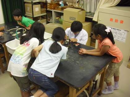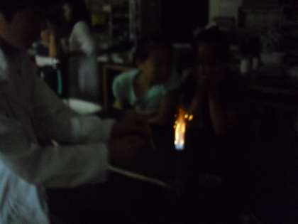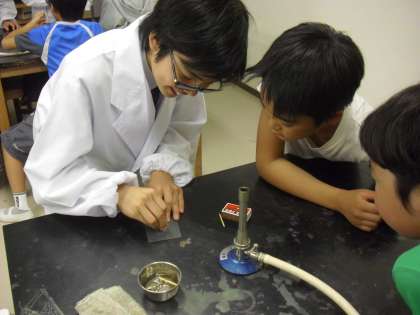 石を細かく削って粉状にし、ガスバーナーの火に向けてとばすと、パチパチ!と燃えました。これには子どもたちも大喜びです。中学生の解説付きです。