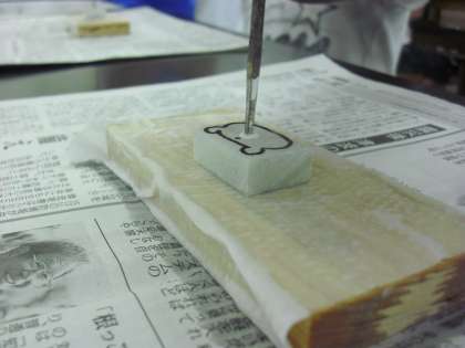 いよいよ勾玉づくりです。勾玉用の石に、まず形を描きます。次に穴を開けます。