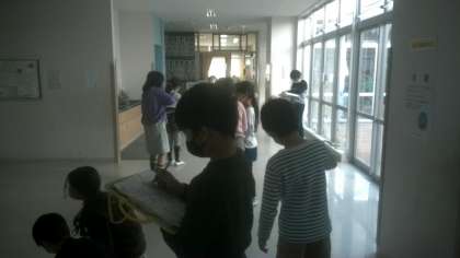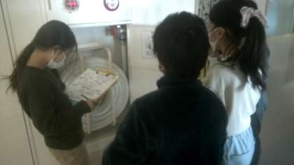 校内の地図を持ちながら、けむり感知器、熱感知、消火器、消火栓、救助袋があるところをチェックして回りました。調べて気付いたことや分かったことを一人一人がワークシートにまとめました。