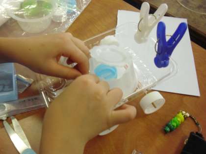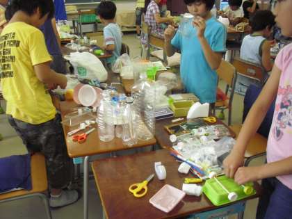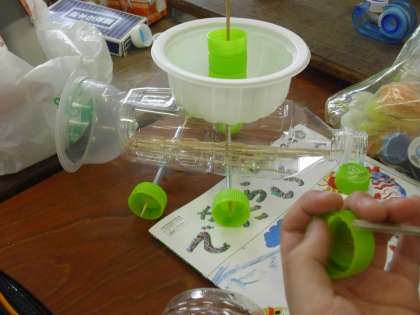 3年生の図画工作の授業の様子です。ペットボトルやプラスチック容器等を材料に動く車を作っています。紙コップやストローなども自由に活用し、ユニークな作品が出来上がりそうです。