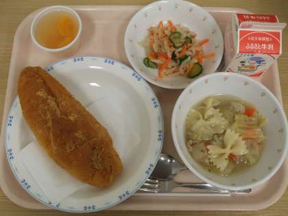 しばらくぶりに、揚げパン(今回はきな粉)の登場です。昔ながらのコッペ形で作ったところ、“いつもの形がよかった〜”との意見が。確かに、ツイスト形の方が、かなりおしゃれに見えますね。