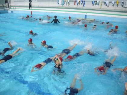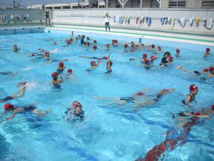2年生の水泳の授業の様子です。毎回練習している水に浮く練習をしているところです。体を伸ばして、体の力をぬいて浮きます。長い時間、浮くことができる人も増えてきました。