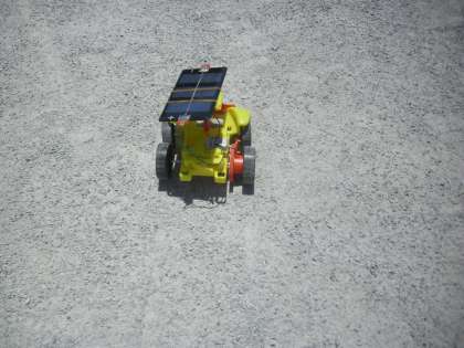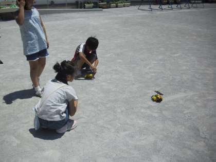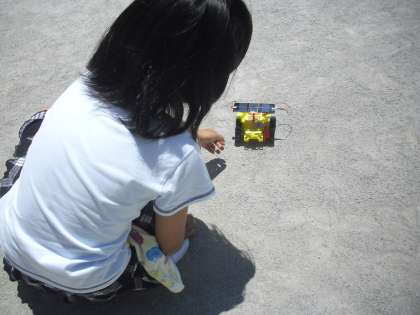 4年生の理科の授業の様子です。「電気のはたらき」の学習で組み立てたソーラーカーを校庭で走らせています。強い日差しをを浴びて、力強く走っていました。