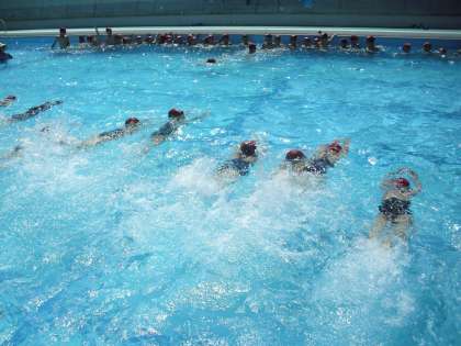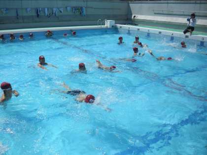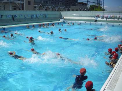 4年生の水泳の授業の様子です。プールの横幅をばた足で泳いでいるところです。泳ぐための基本的な動きなので、しっかりと身に付くようにくり返し泳ぎます。