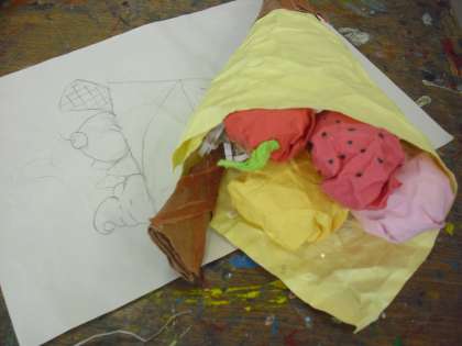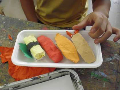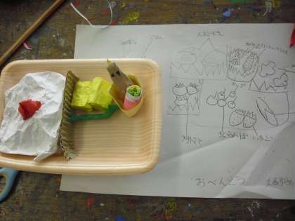 4年生の図画工作の授業の様子です。「わっ!おいしそう」の制作に取り組んでいるところです。食べものの作品です。イメージ画をもとに作っていきます。本当においしそうです。