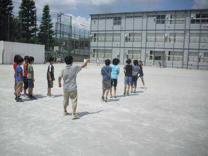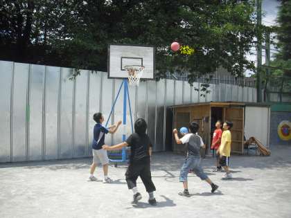 高学年は、バスケットボールのゴールを使って遊んでいます。クラスで長縄に取り組む子どもたちもいます。