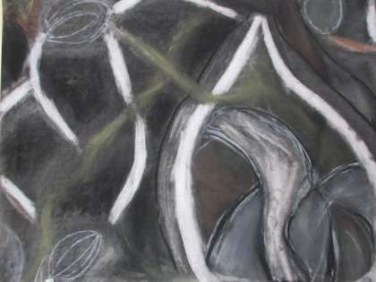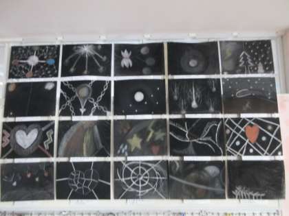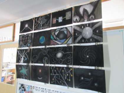 5年生は、「消して描くー命のカタチー」です。黒色のコンテを使って、白い画用紙を真っ黒に塗りつぶし、消しゴムを使って絵を描きました。