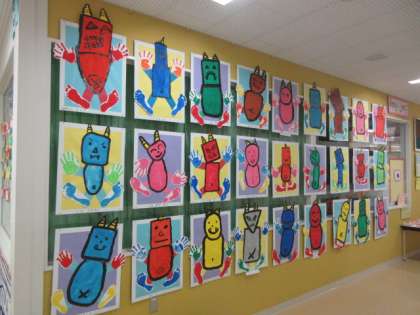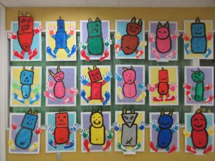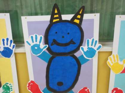 ひかり学級は、「かわいいおに」を描きました。ひかり学級のみんなの手形や足の形が、かわいいおにの手足になっています。どのおにもかわいいので、「鬼は外!」の豆が投げられない…。たくさんの福を呼び込んでくれそうですね。