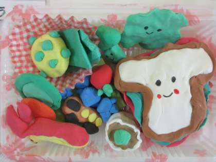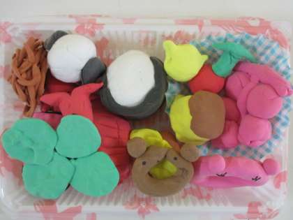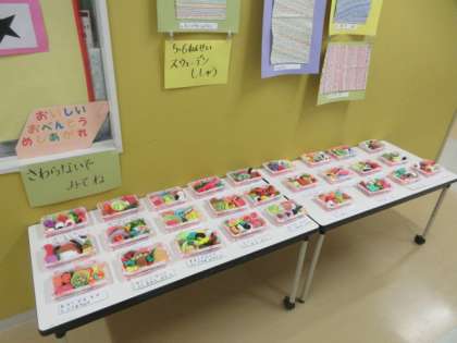 ひかり学級のもう一つの作品は、「おいしいおべんとうめしあがれ」です。カラー粘土を上手に使って、どの子もカラフルで心が踊るくらい楽しそうなおかずをお弁当箱に詰めました。食べたらきっとおいしいんだろうなぁ。