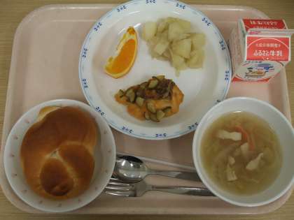 今日の給食には、愛媛県産の「まだい」を使っています。愛媛県の“県魚”であり、“魚の王様”ともいわれる絶品の魚です。コロナ禍で日本の水産業も危機に面しています。微力ながら、給食では国内産水産物をたくさん取り入れていきたいと思っています。