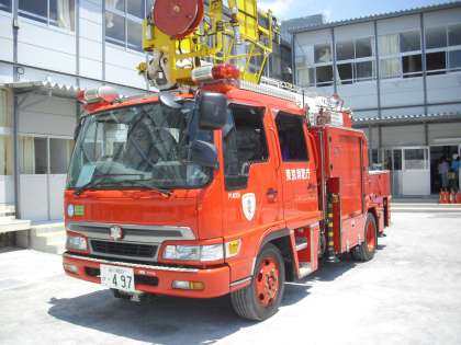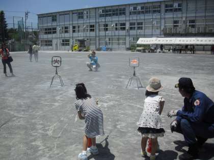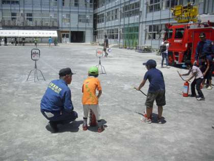 防災訓練の様子です。水消化器を使った消火訓練です。「火事だ〜!」と叫んだら、消化器の安全ピンを抜いて、ホースを持って、レバーを握って、的をねらいます。無事、消火です。