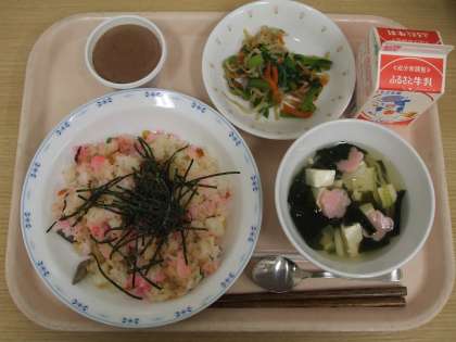 今日の給食は、「桃の節句」の行事食です。具だくさんで彩りよく飾った「ちらし寿司」、花の形のかまぼこが入った「すまし汁」、「お浸し」には旬の食材である“菜の花”を使いました。
