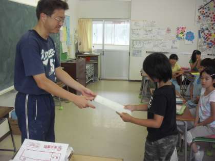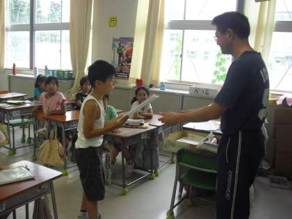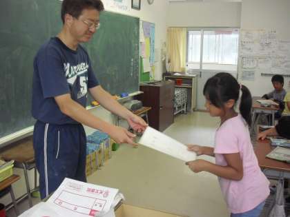 担任が、子ども一人一人に通知表を手渡している様子です。子どもたちががんばったところを褒めながら手渡します。子どもたちは「ありがとうございます。」と受け取っていました。