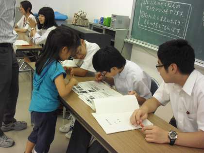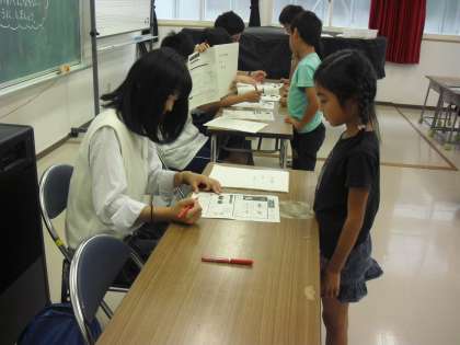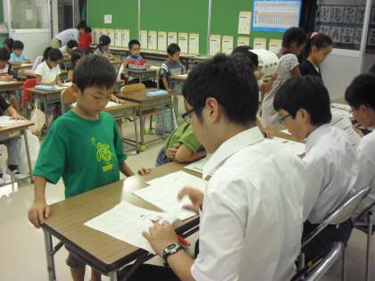 採点を手伝ってくれているのは芦花中学校の生徒です。小学生にやさしく、わかりやすく教えてくれました。中には、おはじきを使いながら計算の意味を教えてくれる生徒もいました。小学生も喜んでいました。
