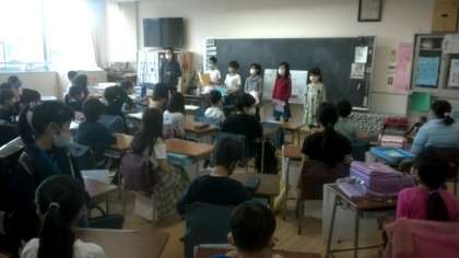 朝の時間に、3年生から始まる学習について、2年生の各学級へ紹介しに行きました。