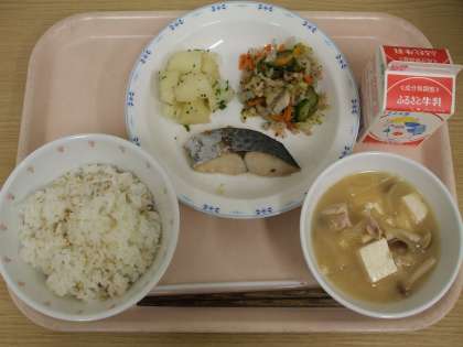 米(茨城)、押麦(福井・富山)、豚肉(青森)、さわら(韓国)、豆腐(東京)、油揚げ(神奈川)、白ごま(スーダン・パラグアイ)、しょうが(高知)、ねぎ・パセリ(茨城)、じゃがいも・たまねぎ(北海道)、キャベツ(愛知)、にんじん(徳島)、きゅうり(群馬)、しめじ(長野)