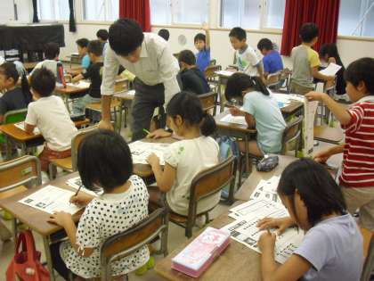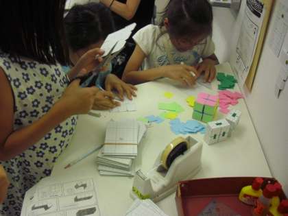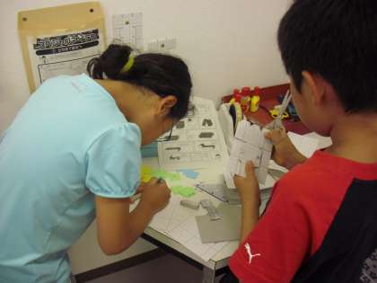プリントだけでなく、展開図を描いて立体を作る課題もあります。この課題を選んだ子どもたちは工作用紙で立体作りです。手を挙げれば、先生がわからないところを教えてくれます。