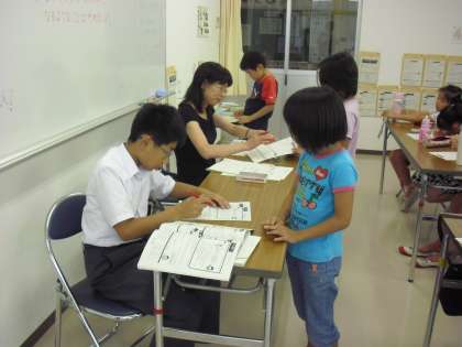 今日も○付けには芦花中学校の生徒が手伝いにきてくれました。子どもたちも二日目になり、慣れてきたようで、お兄さんお姉さんに遠慮なくプリントを見てもらいにいきました。ほほえましい光景です。