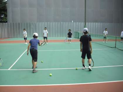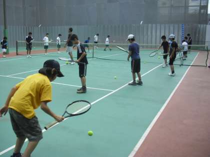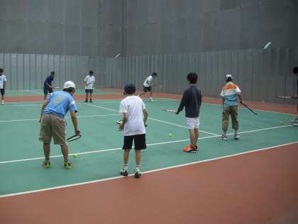 ラケットを使ったボール操作に慣れるための練習です。ラケットの面にボールを乗せて何度もはずませたり、地面に打ったり、ゴルフのように相手にボールを送ったりします。