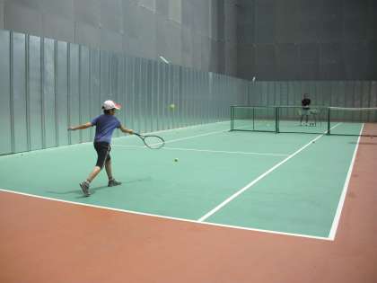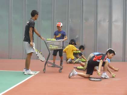 みんなでボールを拾い集めます。そして2セット目です。コーチがトスしたボールを打ち返します。初めてラケットを握った子どもたちも「楽しかった」と感想を述べていました。