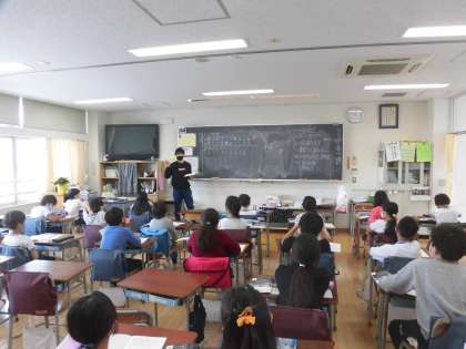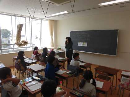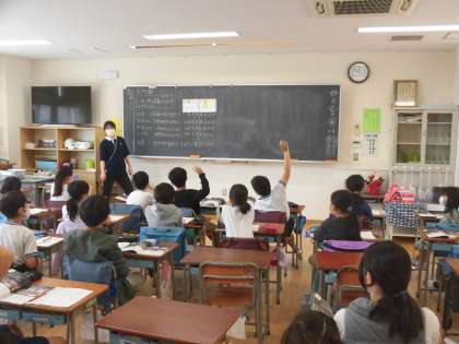 2校時、4年1・2組の教室では、算数の授業が行われていました。いろいろな国の人口を読みながら、千億の位までの数のよみ方、表し方などを学びました。先生方の発問から、じっくり考えて発言している様子がたくさん見られました。