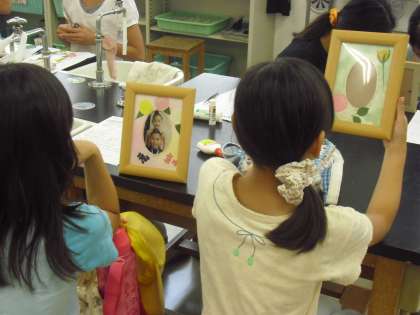 最後に持参してきた写真を、写真立ての中に入れて完成です。手作りのすてきな写真立てができました。大満足の子どもたちでした。