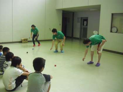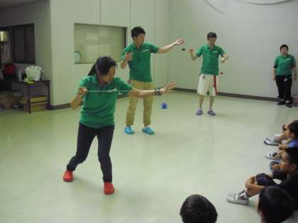 本日のサマーワークショップ「ハイパーヨーヨー」の様子です。講師はヨーヨーファミリーの皆さんです。まずは、技のデモンストレーションです。華麗なテクニックに子どもたちも驚いていました。