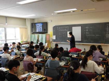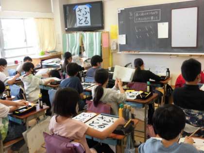 4月27日(火)3・4校時、5年5組の教室では、書写の学習に取り組んでいました。ひらがなの「い」から、点画のつながりと字形の関係を学び、「ふるさと」を毛筆で書きました。書画カメラで映し出された見本をよく見て、点画のつながりを意識しながら集中して書いていました。