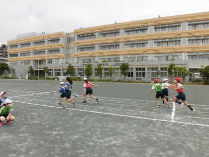 この日が、リレーを学習する最後の日。チームでコーナーでの体の傾け方やバトンパスなどの練習を行い、いざ本番。「緊張する。」「勝てるか、不安だ。」などと口にする子供が多かったですが、走る姿はどの子も輝いていました。
