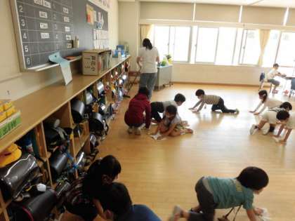 1年生は、5月から5時間授業が始まりました。もちろん、掃除の時間や昼休みもあります。そこで、今週5日間は、6年生がクラスごとに1年生の掃除を手伝いに行きます。トップバッターは、6年1組。給食を食べた後に、割り当てられた1年生のクラスに行きました。手伝うだけではなく、掃除の仕方も教えていました。掃除後には、昼休みも一緒に遊びました。